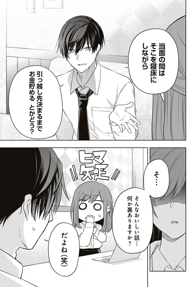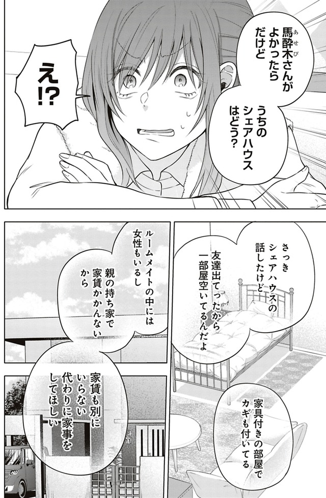 彼氏に浮気され家を飛び出したところに、会社の先輩・青木と出くわす。イケメンで仕事ができて、でも普段はちょっぴり塩対応な青木だが、意外にも傷心のはなに優しく寄り添い「俺の住んでるシェアハウスに来るのはどう?」と提案してくれる。だがそれは、オモテの顔に過ぎず…。