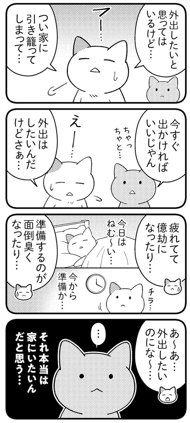 おそらく、外に出たいのに引き籠ってしまう日は、内心はそこまで外に出たくないか、家にいたい気持ちが勝ってしまってるんです。休日は家にばかりいてはいけないとか、外で何かしなくちゃとか、そういう理由で外出したいだけなんです。本心が「家にいたい」なら、勝てるわけがありません。それを「外出したいのに引き籠ってしまった」と考えれば、「私はダメだな」って、ネガティブになってしまうと思うんです。