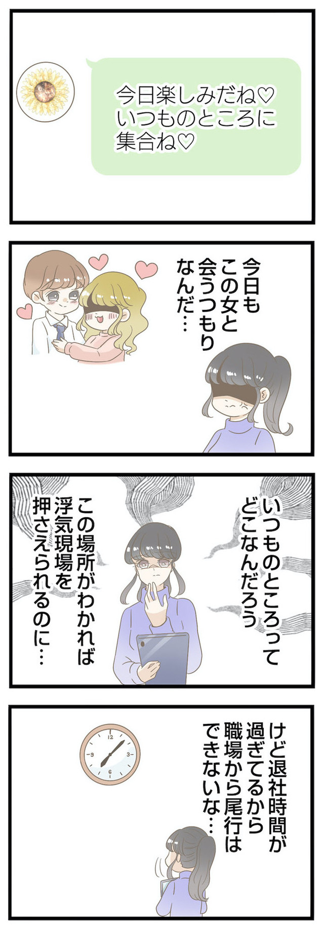 出張に行く夫を見送った後、新居のベッドルームで夫の不倫の証拠を見つけてしまう。