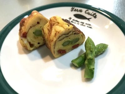 たまご焼き器にごま油をひいて溶きたまごを流し入れ、アスパラガスを中心に置いて、弱~中火で加熱しながら巻いていきます。器に盛りつけて、アスパラガスの穂先を添えたら出来上がりです。