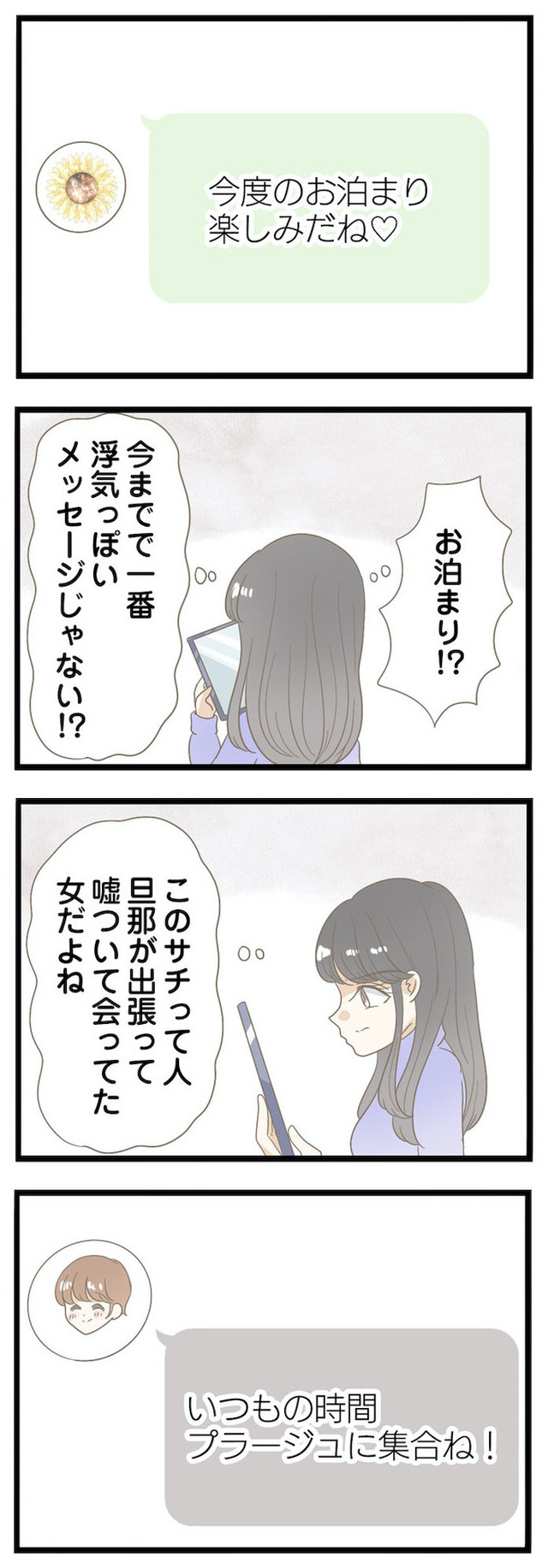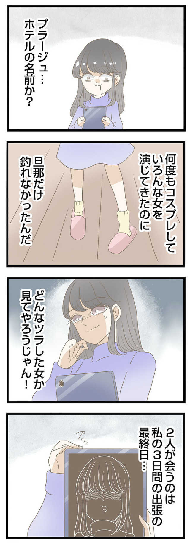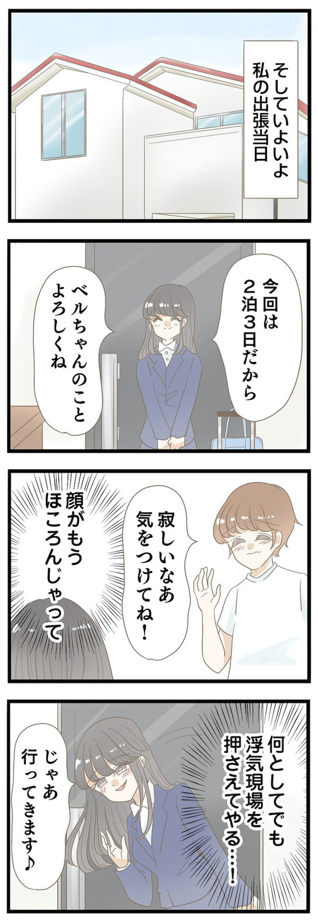 出張に行く夫を見送った後、新居のベッドルームで夫の不倫の証拠を見つけてしまう。