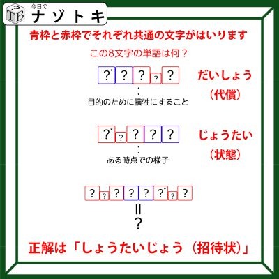 加えてそれぞれの単語のヒントから上二つの例示から赤枠と青枠の文字を特定して答えの言葉を導きます。