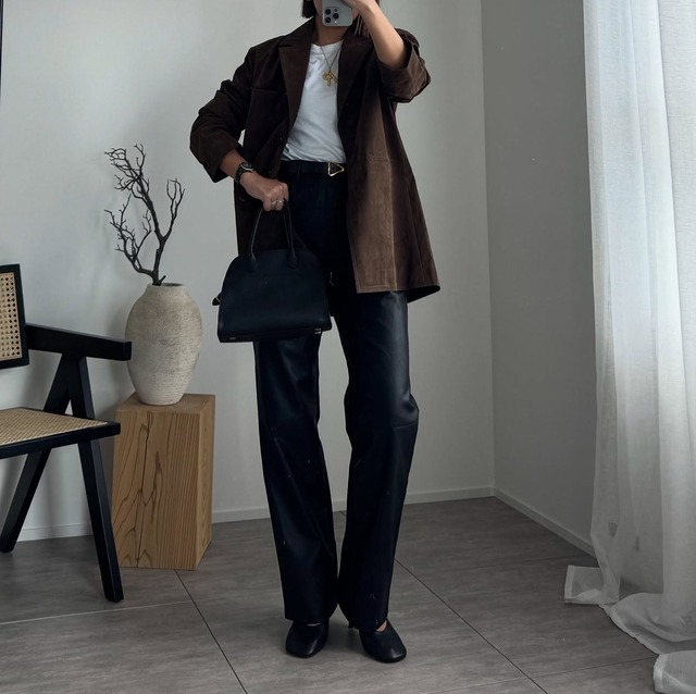 トップスには、オーバーサイズのジャケットを選び、インナーに白Tシャツを合わせることで、全体に抜け感をプラス 。このブラウンと黒のシックな配色に、白の軽さが加わることで、重たくなりすぎず、絶妙なバランスが生まれています。レザーパンツというトレンドアイテムを、シンプルな配色と組み合わせることで、ひとクセのある着こなしを完成させています。