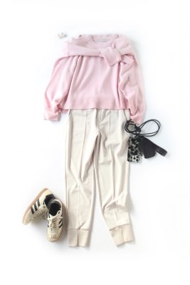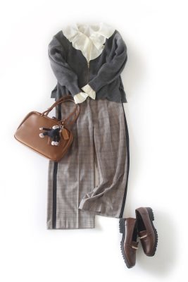 スリムウォームラインワイドパンツ 8,250円、フリルVネックブラウス 7,700円、Vネックジップカーディガン 7,700円、バッグ 7,700円(一部チャーム私物)、ローファー9,350円/以上Elura(アダストリア)