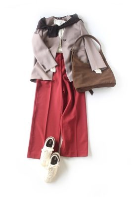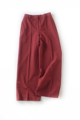 PLST(プラステ)のウォームリザーブシリーズからはちょっと珍しいカラーのワイドパンツをセレクトしました。表記はワインですが、トマト煮みたいな黄味のある赤色です。