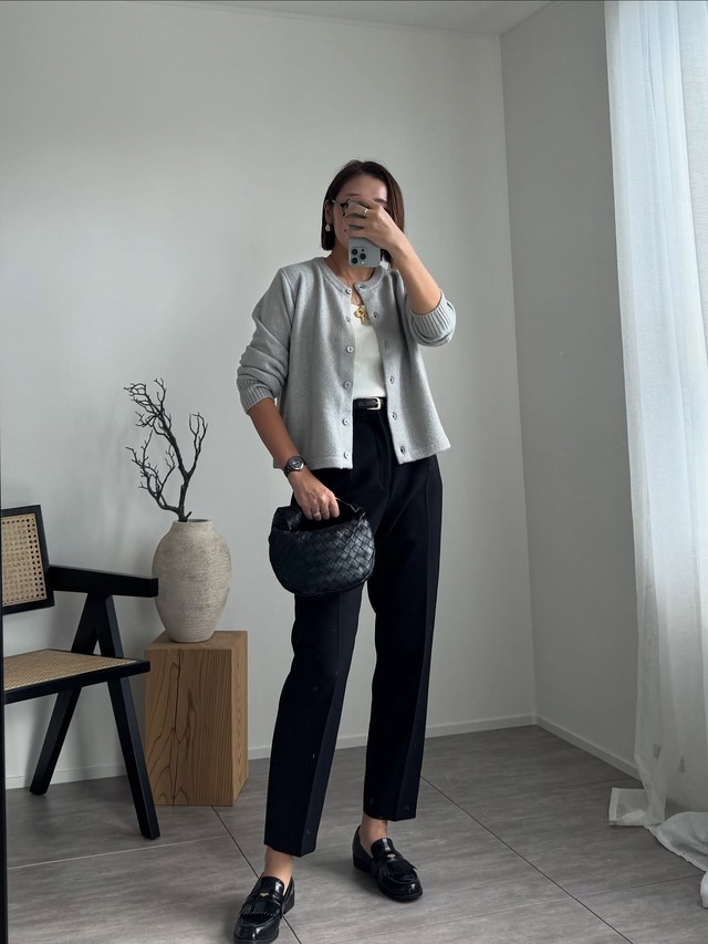 ボトムスには黒のアンクル丈パンツを合わせ、足元はきちんと感のある黒のローファーで統一。トップスとボトムスで配色をシンプルにすることで、カーディガンのデザイン性が際立ちます。バッグは黒の編み目素材を選び、素材感の違いで奥行きを出すという、細部まで計算された洗練スタイルです。