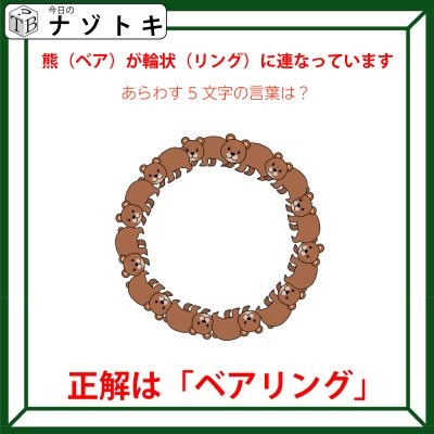 この動物はクマです。クマがどうなっているかをみてみるとそれが輪状、リングになっています。また、クマを英語になおすと「ベア」ですね。つまり、ベアがリング状になっているということです。ベアがリング、そうです!「ベアリング」です!正解は「ベアリング」でした。