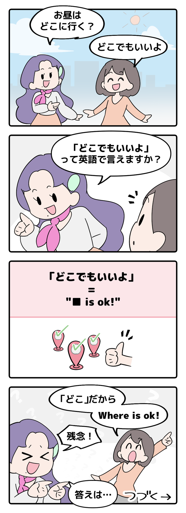 「英語嫌いな日本人をなくしたい!」海外生活や添乗員経験、そしてバイリンガル子育て中の英会話講師・Mrs.服部が、身近な英語表現を漫画&クイズ形式でお届け! 「間違ったら恥ずかしい」じゃなく「伝わればOK」。使えるフレーズをマンガで学びましょう!
