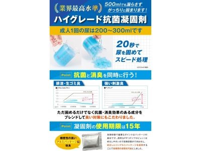 水のいらない 非常用トイレ。「吸水力」「消臭性」を兼ね備えた高性能凝固剤を採用し、15年間の長期保管が可能! 防災ガイド付きです