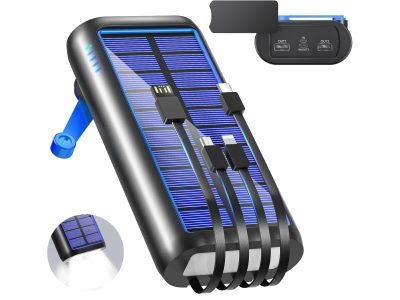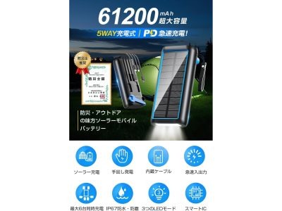 ソーラーモバイルバッテリー 22.5W/PD18W 61200mAh 【2025新登場 & 急速充電 】 手回し充電 ソーラーチャージャー 防災士監修 4本ケーブル内蔵 Type-C モバイルバッテリー ソーラー IPX7防水 耐衝撃 携帯 スマホ充電器 LEDライト付き 停電対策 SOSモード 地震/災害/旅行/アウトドア iPhone/Android各種デバイス対応 (ブルー)