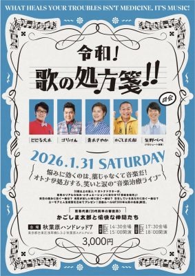 悩みに効くのは薬じゃなくて音楽だ! というわけで、50歳以上の芸人&音楽プロデューサー「オトナドクター」5名が若者のリアルな悩み・シチュエーションに合わせて音楽を処方する音楽トークショー。第一弾大好評のため、第二弾の開催です。