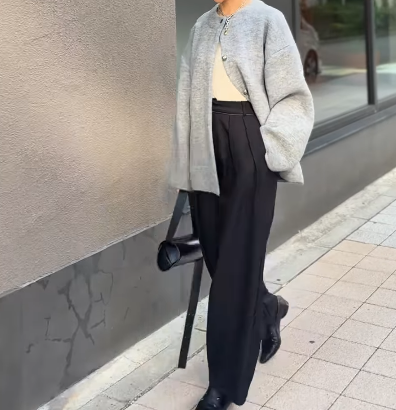 きれいめなパンツスタイルにもカジュアルにも合わせやすい、着回し力の高そうなカーディガンです。カーディガンは袖にボリュームがある分、丈が短めなので、重たい印象にならずバランスがとりやすいデザインです。ボトムスは黒のワイドパンツ、インナーには白を合わせて、全体を落ち着いた配色でまとめています。