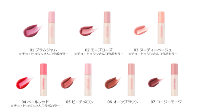 01 プラムジャム02 モーブローズ03 ヌーディーベージュ04 ベールレッド05 ピーチメロン06 オーツブラウン07 コージーモーヴ