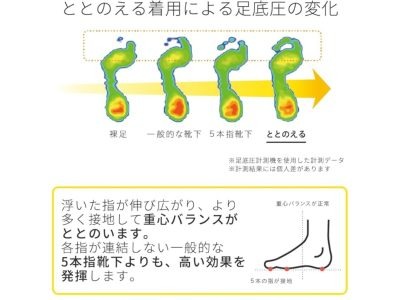 中が5本指に仕切られた構造で、指を正しい位置に配置! 重心バランスをととのえて「疲れやすい」「足裏痛い」を解消