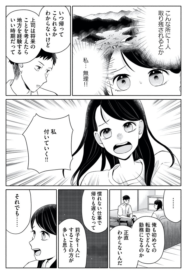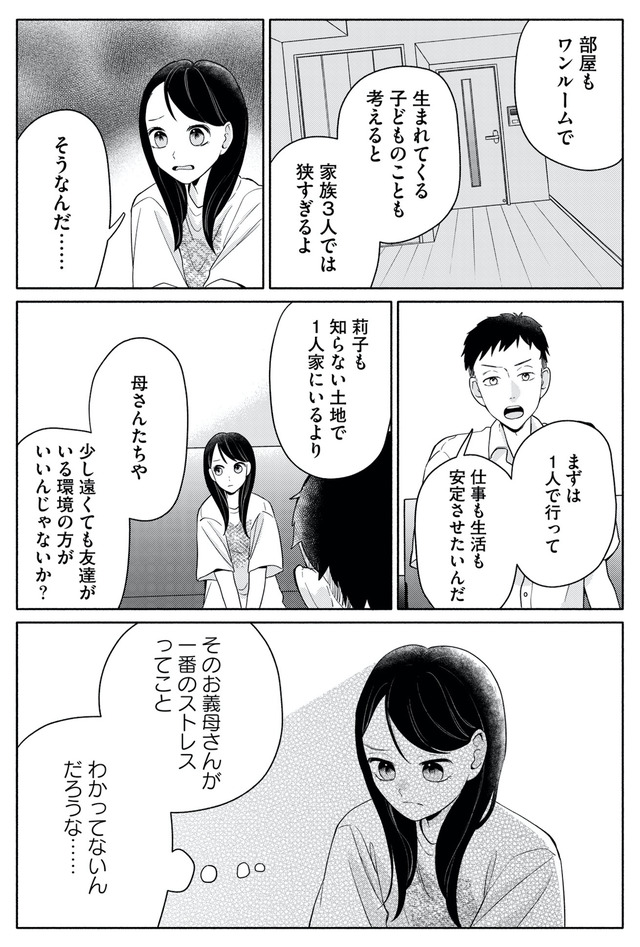 つらい日々の中で妊娠が判明するも、追い打ちをかけるように夫の単身赴任が決まり、莉子はひとり取り残されてしまう。