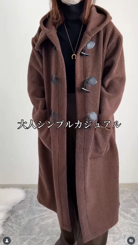 インフルエンサーのhappy_acoacoさんがコーデの主役に選んだのは、こっくりとしたチョコレートカラーのテディ素材ダッフルコート。ふわふわのテディ素材は見た目にもやわらかく、冬らしいかわいらしさが感じられますね。インナーにはユニクロの「メリノリブタートルネックセーター」2,990円(162cmでサイズM着用)を合わせ、ボトムスは落ち感のあるブラウンのタックパンツを着用。コートとパンツの丈感が絶妙で、ゆったりとしたシルエットながらも、全体的に縦のラインが強調されていて、スタイルアップして見えます。金色のネックレスがアクセントになり、上品さもプラスされていますね。