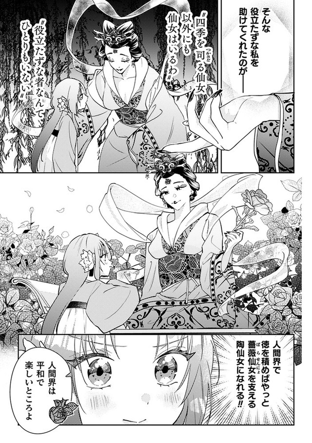 桜 桃香、18歳。「役立たずだった私を助けてくれた薔薇仙女を支えるため、一人前の陶仙女になりたい!」人間界で修行を始めた桃香は、陶器の声が聞こえる能力を活かし、食堂を営みながらお客さんの不調を治して徳を積んでいた。