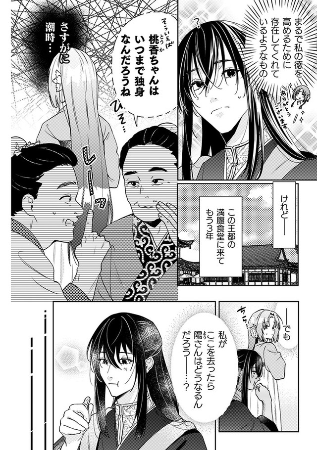しかし火事が起きて店は消失。食堂の常連で後宮に仕える美しい青年、陽伊鞘に救われるが、彼の頼みで後宮付きの薬膳医になることに。