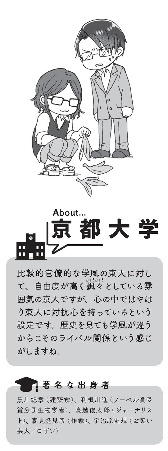 どの大学がどんな“クセ”を持つ? 首都圏・関西の国公立から私立、旧帝・理系・女子大・芸術大まで計70校をユニークに擬人化。ブログで話題を呼んだ連作が大幅加筆&描き下ろし多数で待望の書籍化。志望校や出身校の“あるある”を探してみよう!学風や学部、学食、キャンパス事情まで全方位の“あるある”ネタ満載。受験生も卒業生も楽しめる読み応えの一冊。