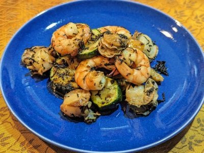 作り方は、えび(10尾)の殻をむいて背ワタを取り、ベビー帆立(10個)と合せて、酒(大さじ2)・塩こしょう(少々)で下味をつけます。ズッキーニ(1本)は厚さ5mmの輪切りに、にんにく(1片)は包丁の腹でつぶします。