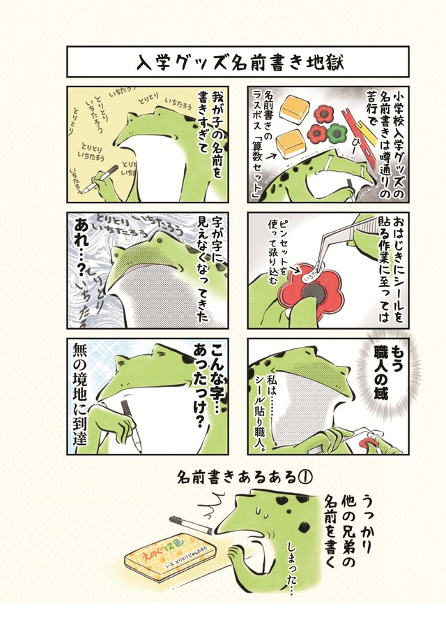 インスタで大人気のユウコトリトリが描く『カエル母さん』は、カエルの長男とおたまじゃくしの次男を中心に育児や家事の“あるある”を鳥獣戯画風にコミカルに描いた四コマ集。