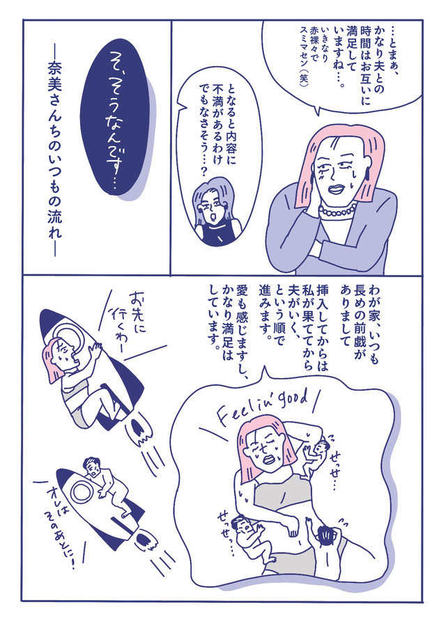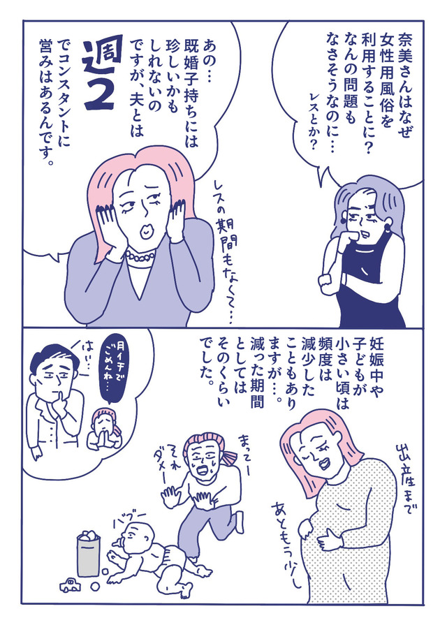 第3話ではプリオさんの体験談を読んで「女性用風俗に関心が湧いてデビューした!」というフォロワー奈美さんへインタビュー。夫さんとの性生活も大満足、仕事も順調。そんな奈美さんがなぜ女性用風俗へ????しかも初回からダブルセラピストって???みんなが気になるアレコレを根掘り葉掘り聞いちゃいました。