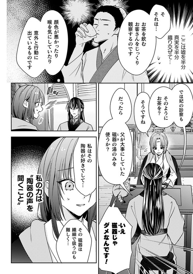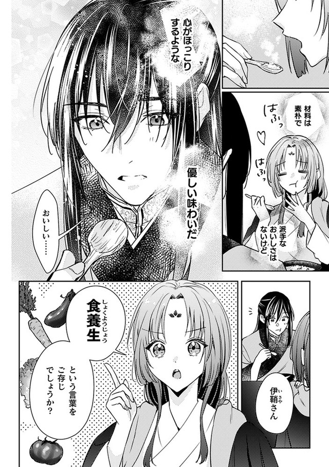 しかし火事が起きて店は消失。食堂の常連で後宮に仕える美しい青年、陽伊鞘に救われるが、彼の頼みで後宮付きの薬膳医になることに。