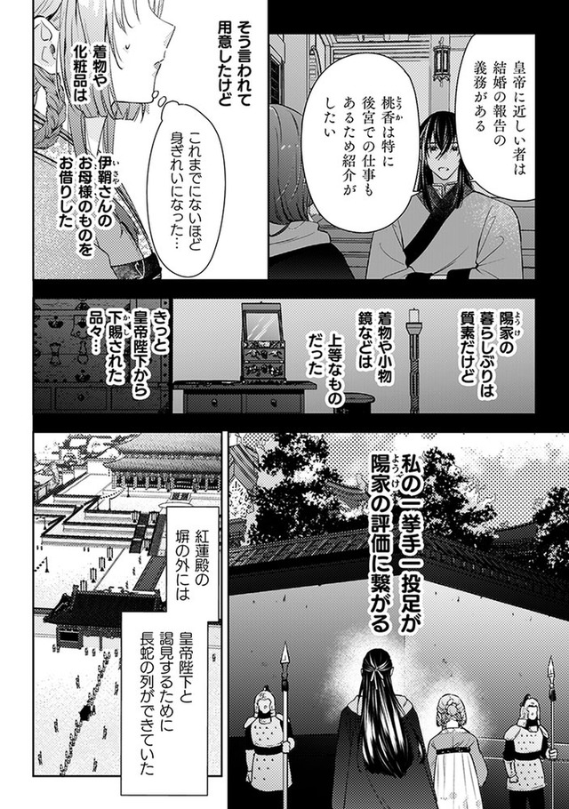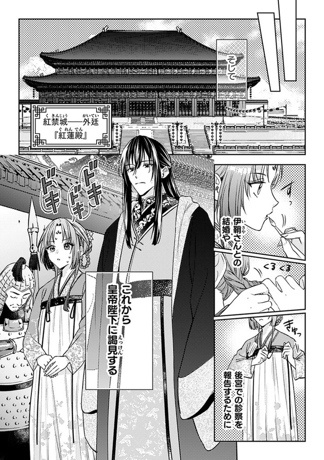しかし火事が起きて店は消失。食堂の常連で後宮に仕える美しい青年、陽伊鞘に救われるが、彼の頼みで後宮付きの薬膳医になることに。