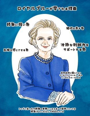 また、ロイヤルブルーは集中力と冷静さ、深い内省をもたらす色とされています。この色を身につけていると自然と冷静な判断力が養われるとともに、誠実さのある印象を与えるといわれているのです。そうした由来から、とかく女性政治家に好まれるカラーとしても有名です。