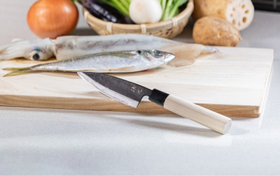 明治41年創業、能登の漁業や農業を支えてきた老舗の鍛冶屋、ふくべ鍛冶が生んだイカ割き(さき)包丁。小木港がある能登町で誕生し、プロから家庭まで幅広く愛用される逸品です。小ぶりで抜群の切れ味が特徴。イカや小魚などの魚介類の下処理がしやすいように作られた包丁は、慣れない人でも使いやすいと女性にも人気。刃に刻印された「孫光」には、孫の代まで輝き続けるという職人の想いが込められています。