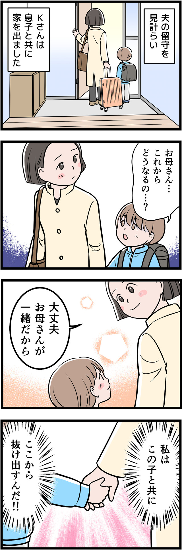 夫の教育虐待により、ストレスで壊れそうになっていた息子を連れて家を出たEさん。しかし夫は「誘拐で訴える」と脅してきました。