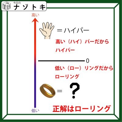 よって、低い時につくのは「ロー(low)」であり、描かれているイラストは「リング」なのでそれらをつなげて読んでみましょう。正解は「ローリング」でした。