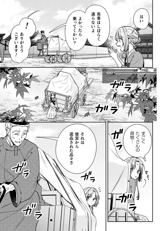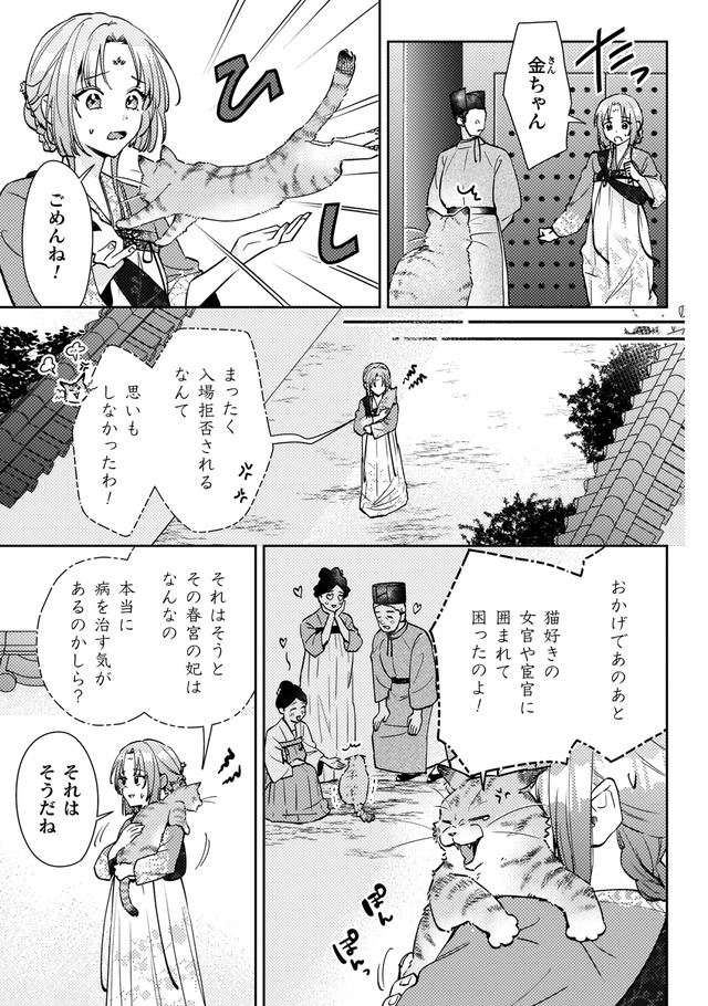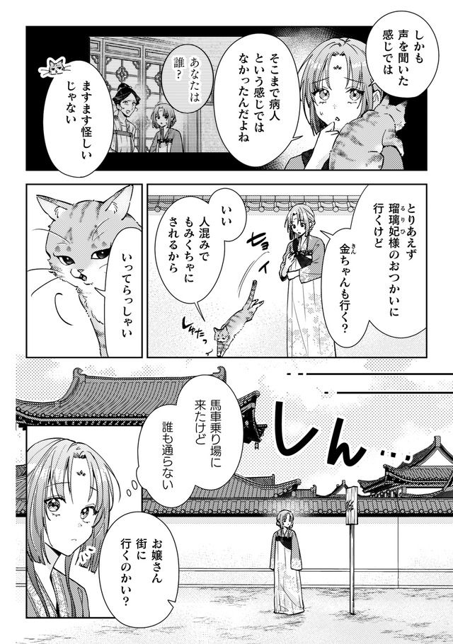 しかし火事が起きて店は消失。食堂の常連で後宮に仕える美しい青年、陽伊鞘に救われるが、彼の頼みで後宮付きの薬膳医になることに。