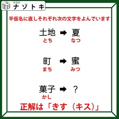 後は問題を考えていきましょう。「かし」のそれぞれの文字をずらすと「きす」となります。よって、正解は「きす(キス)」でした。