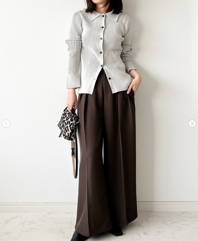 きれいめなシルエットのワイドパンツを主役にした、すっきりとしたモノトーンのコーディネートです。インフルエンサーのtomomiyu0920さんが着こなしているのは、センターにプレスの入ったワイドパンツ。センタープレスのおかげで、ワイドシルエットでもだらしなく見えず、脚長効果ときれいめな印象が叶います。トップスにはグレーのスウェットを合わせて、全体をシックなトーンで統一。スウェットをタックインせずに着ることで、リラックス感と今っぽい抜け感が生まれています。ヒョウ柄のバッグでドレンド感とやさしい差し色をプラスし、大人っぽく洗練された雰囲気に仕上がっています。オンにもオフにも使える万能パンツの着こなし方、ぜひ参考にしたいですね。