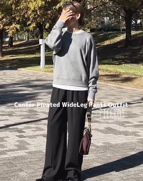 グレーのスウェットに黒のワイドパンツを合わせた、リラックス感漂うオトナカジュアル。一見ラフな組み合わせですが、センタープレスの効いたパンツを選ぶことで、きちんと見えするスッキリとした佇まいに仕上がります。このパンツはストンと落ちるシルエットがとにかくきれいで、脚のラインを拾いすぎないのがうれしいポイント。後ろがゴム仕様になっているため、履き心地も楽ちんでアクティブな日にもぴったりです。