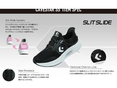 【コンバース】かかと部分に採用した技術がすごい! 靴を履く際は切れ目が広がって上端が後方へ傾斜し、素早く履ける仕組み。着用時は切れ目が元に戻ってかかとを安定的にサポート