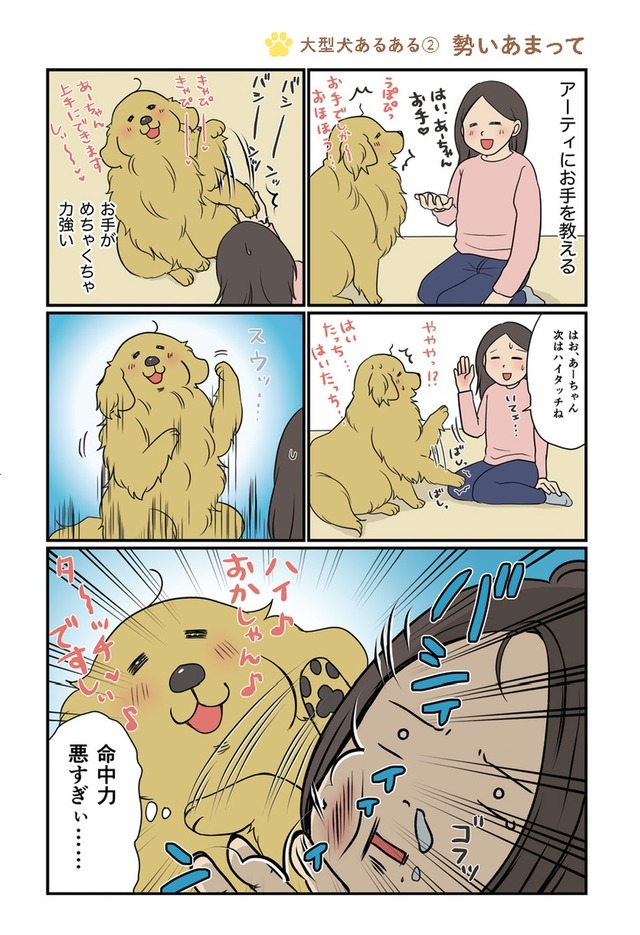 「ですし!」が口癖のゴールデンレトリーバー・アーティと、いつもイライラ怒ってばかりなのに家族思いなハチワレ猫・まめ。