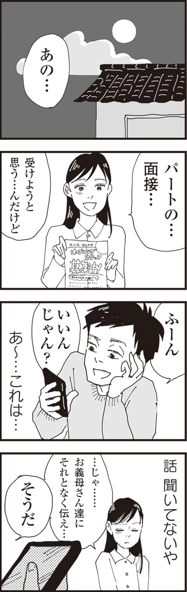 一方、忍の妻・香織は、最近になって夫の様子に違和感を覚え始める。夫の不倫相手は、娘のママ友であり、夫の職場で働くパートのなな子だった。