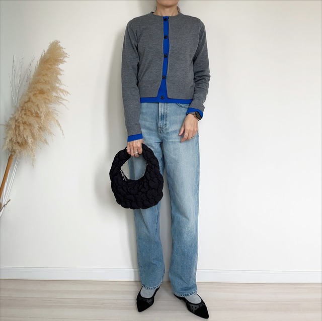 いつものデニムスタイルを新鮮に見せたいとき、cococloset128さんのような色使いが参考になります。主役は以前、ZARAで購入した「バイカラーニットカーディガン」。落ち着いたグレーに鮮やかなロイヤルブルーのラインが効いたデザインは、羽織るだけで顔まわりをパッと明るく見せてくれます。コンパクトな丈感のトップスに対し、ボトムスにはゆとりのあるストレートデニムを合わせて、上下のボリュームにメリハリをつけるのがこなれ感を生む秘訣です。