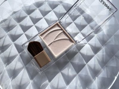 一方、「セザンヌ ブレンドカラーチーク H1 ペールハイライト」は、繊細なパールによる煌めきでツヤ感や立体感を与える王道のハイライト。確かに繊細な輝きなのですが、ホワイト、イエロー、ピンク、ベージュと色とりどりのパールが肌のうえで目立つ印象があります。そのため、肌から若干浮く印象があり、40・50代の肌に塗ると、毛穴やシワを悪目立ちさせる可能性があります。