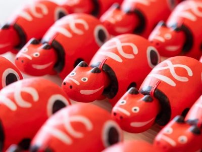 会津地方の郷土玩具「赤べこ」発祥の地が、柳津。2024年にリニューアルオープンした駅舎には、赤べこ工房が併設され、絵付け体験を楽しめる。「どんな模様にしようかな」と考えながら筆を動かす坪山良子さん。体験の所要時間は約60分。予約優先。
