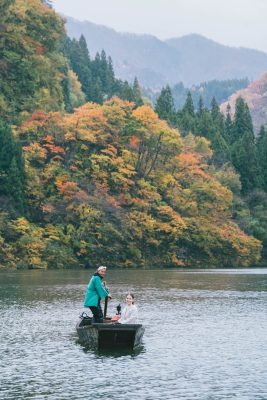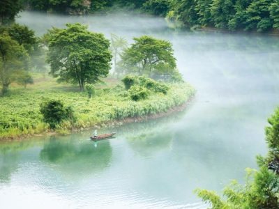 60年前に廃村になった集落と対岸を結んでいた只見川の渡し舟が、観光用に復活。船頭が漕ぐ渡し舟に乗り、川霧に包まれながら幻想的な風景に出逢える。「眼前に迫る峡谷と、澄みきった川面にゆらゆら映る景色が美しい。水の流れはほとんどなく、静謐な雰囲気」