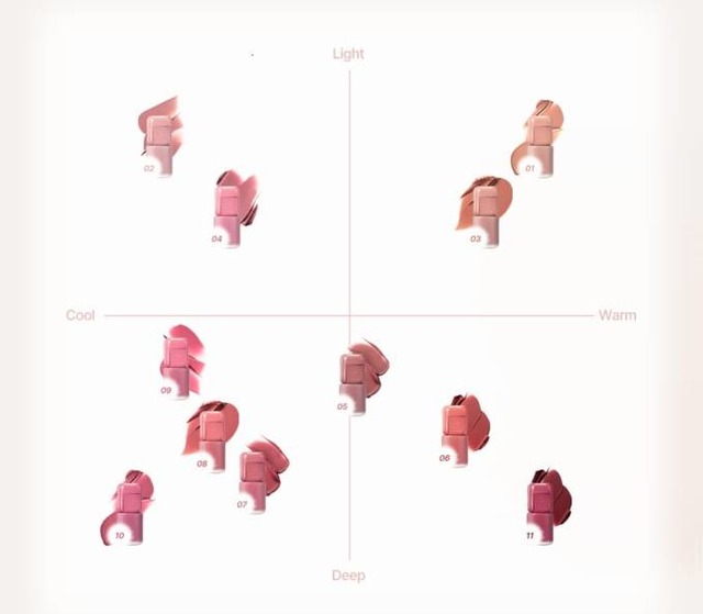 #01 ヌードベージュ#02 ナッティーピンク#03 べべサーモン#04 バニーフラッシュ#05 ロージーオート#07 ミューティッドチェリー#08 ロゼブリーズ#11 ロースティングフィグ