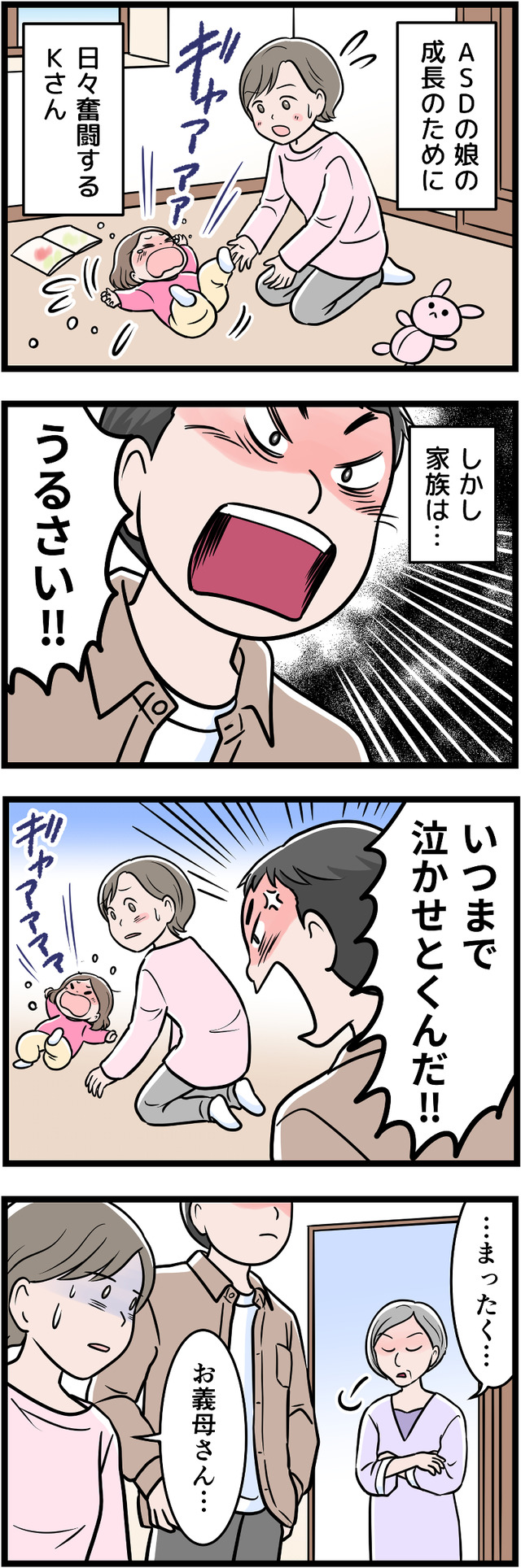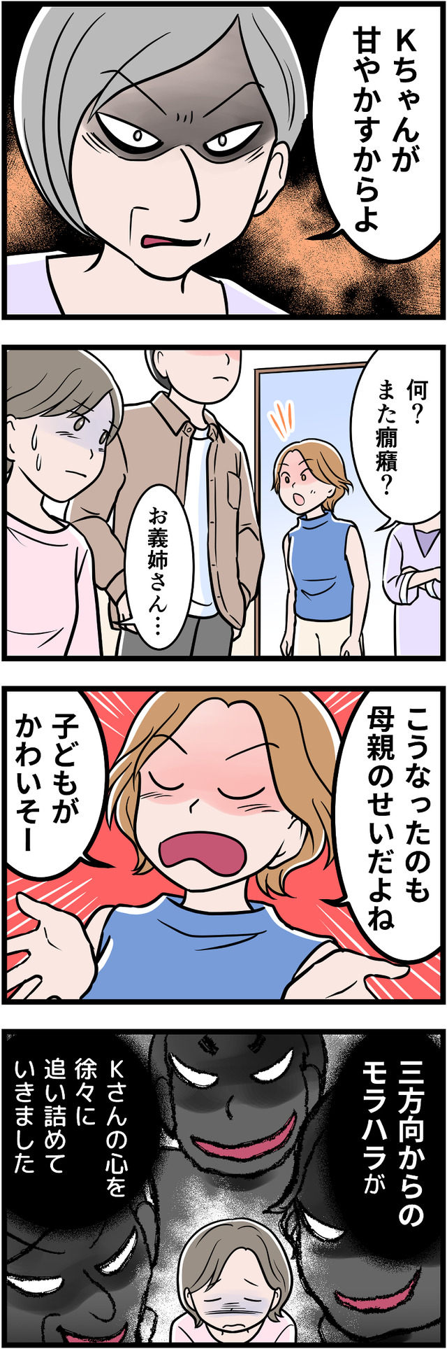 しかし理解のない夫、義母、義姉による三方向からのモラハラが、Kさんを追い詰めていきます。