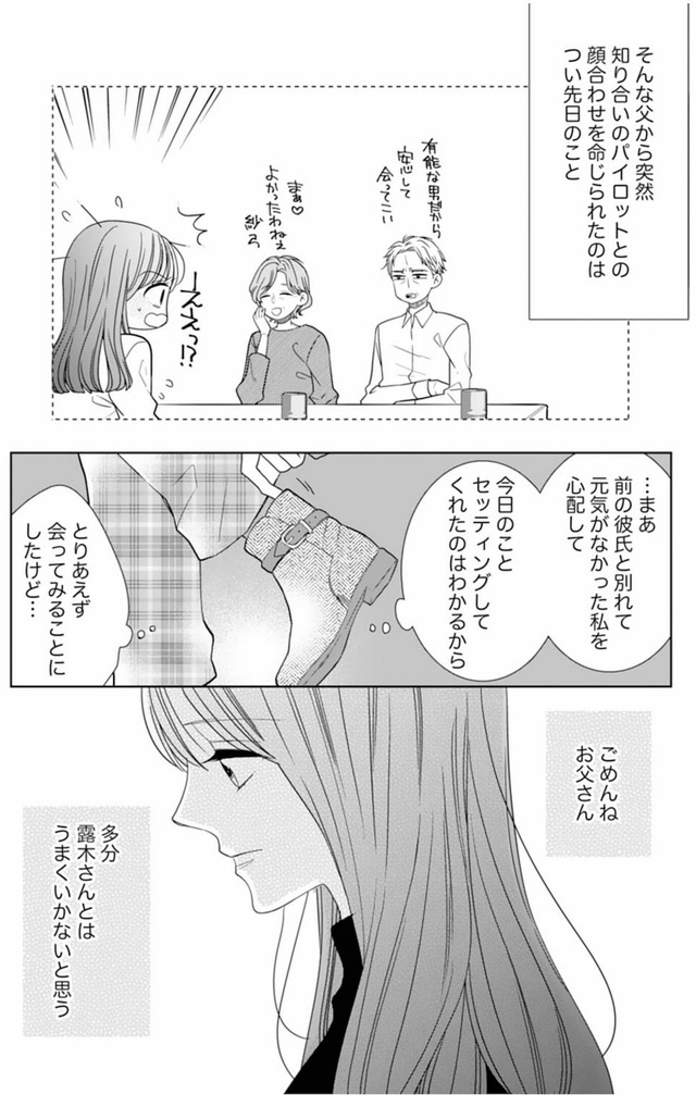 パイロットの元恋人に裏切られた過去から縁談を断るつもりだったが、待ち合わせの場で露木も結婚する気がないと知り、ひと安心する。