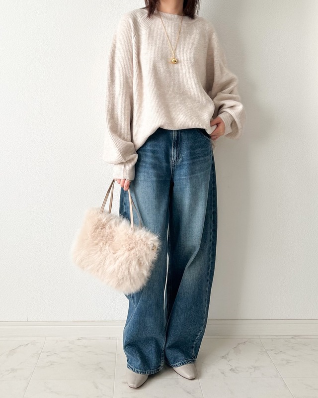 ゆとりのあるワイドデニムにフロントだけ軽くインすることで、ウエスト位置を高く見せつつ、気になる腰まわりを自然にカバーできます。足元にはきれいめなパンプスを合わせ、バッグにファー素材を取り入れることで、季節感のあるアクセントをプラス。シンプルながらも計算されたシルエットが、都会的で洗練された印象を与えてくれます。