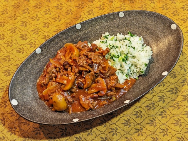 通常のハヤシライスは赤ワインを使うことが多いようですが、今回は“山楂子リキュール”の風味を生かすために、赤ワインではなく赤みそを使いました。トマトの旨味と酸味、山楂子の甘みと苦み、赤みその味の深さがうまく合わさり、しっかりとした「ハヤシライス」になりました。山楂子リキュールをみりんのような隠し味として使うことで味に広がりを持たせること出来るので、大寒の時季を通してぜひ活用いただければと思います。