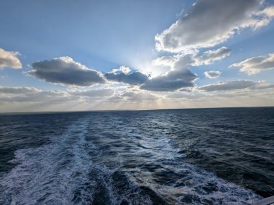 また、熊本県から西の方角に広がる海は東シナ海です。寒い時季は大陸からの風をダイレクトに受けるため荒れることが多く、特に西高東低の冬型の気圧配置では強めの時化に見舞われます。時化の合間に当たる凪のタイミングで運良く船に乗れると、写真のような光景に出会うことができます。船のまわり360度、見渡す限り水平線という環境で魚釣りをしながら1日を過ごすと「自然の中で生きているんだな」と実感します。