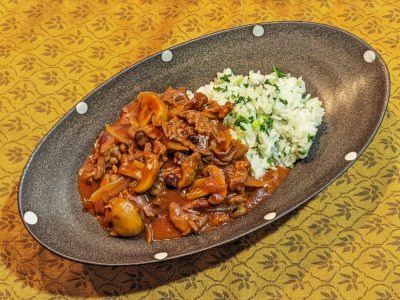 ニラごはんの黒豆&山楂子(さんざし)ハヤシライス。ハヤシは実は「この時季とても理にかなっている」